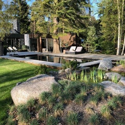 Svømmeområde 8 x 4 meter + 10 m2 naturlig formet vandrensning/skimmersø = 42 m2 vandspejl i skøn harmoni med omgivelserne.