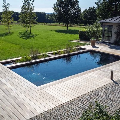 Størrelse 9 x 4 meter med lavt vand zone 120 cm med granitfliser i bunden.