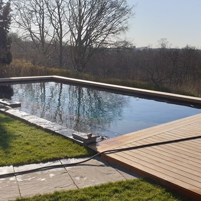 Størrelse 8 x 5 meter med indbygget biofilter Svømme Området der udgør 4x8 meter - Dybde 150 cm - massiv trappe i sandsten - Poolkant og trædesten i Dark Sandstone Beklædning/solterrasser med Thermowood