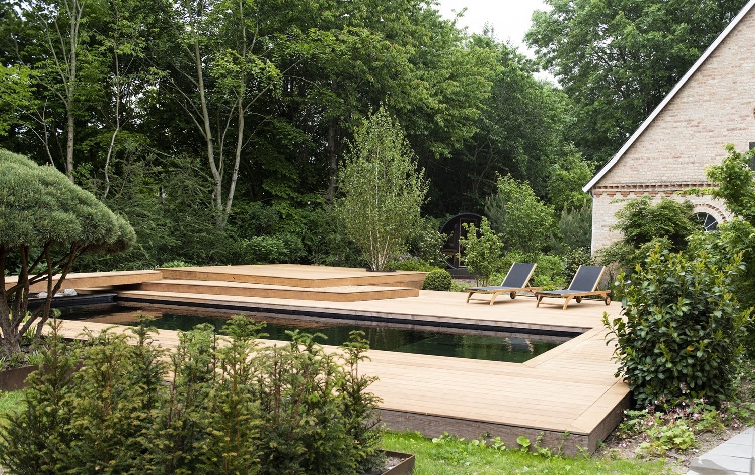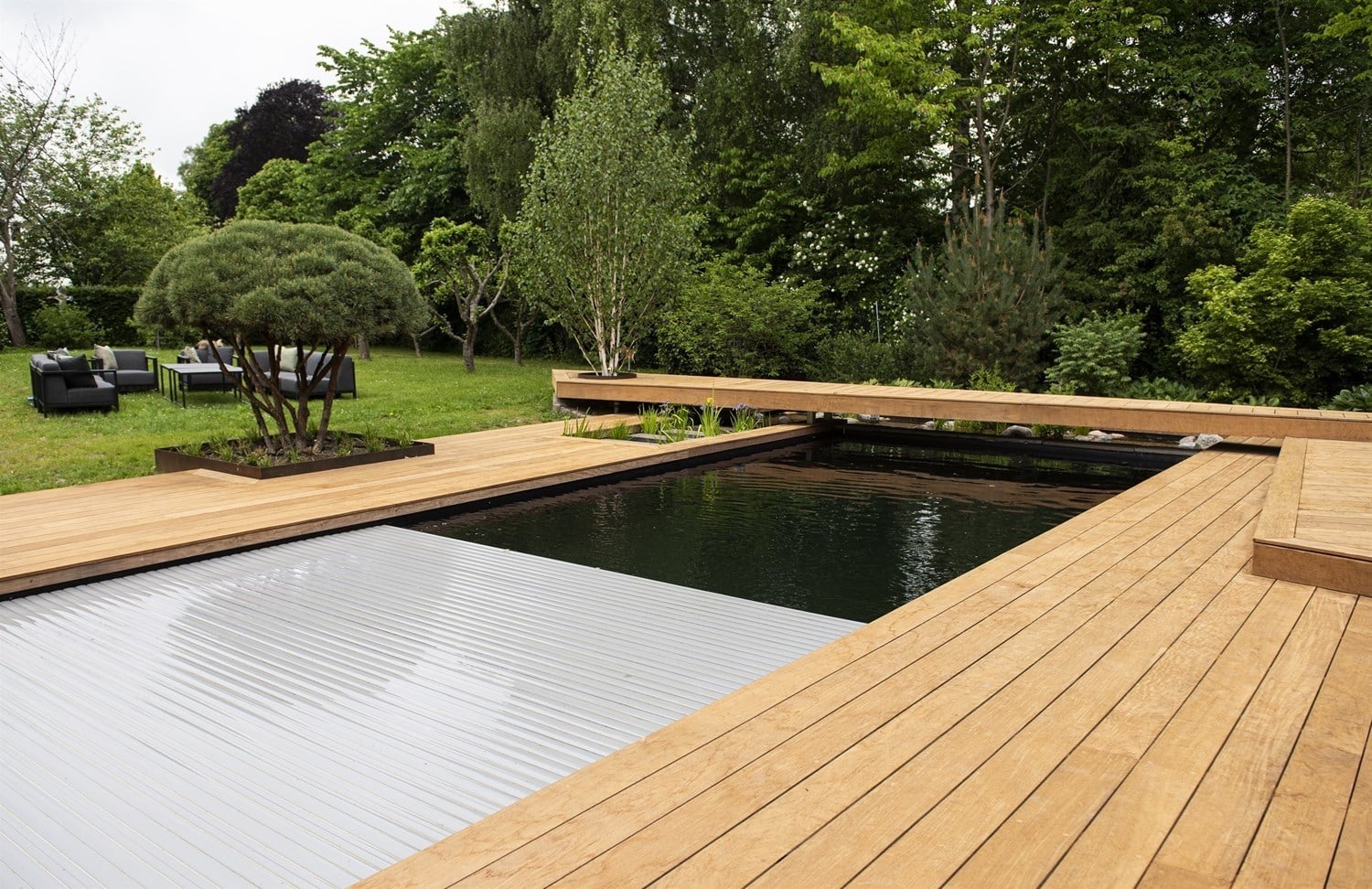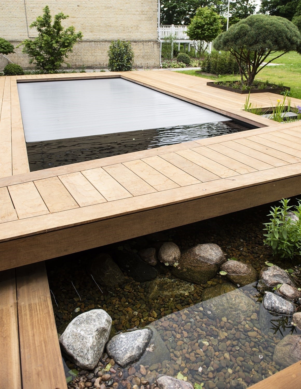 Naturpoolen måler 4×10 meter – 2 meter dyb – lavt vands zone på 120 cm, med en granittrappe til land.
