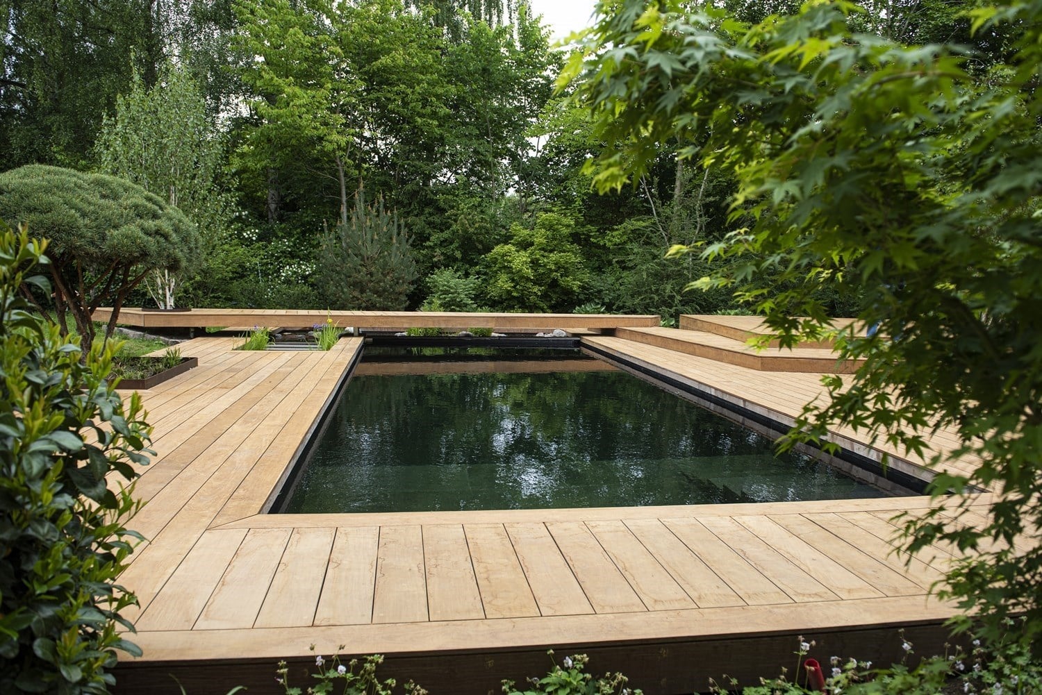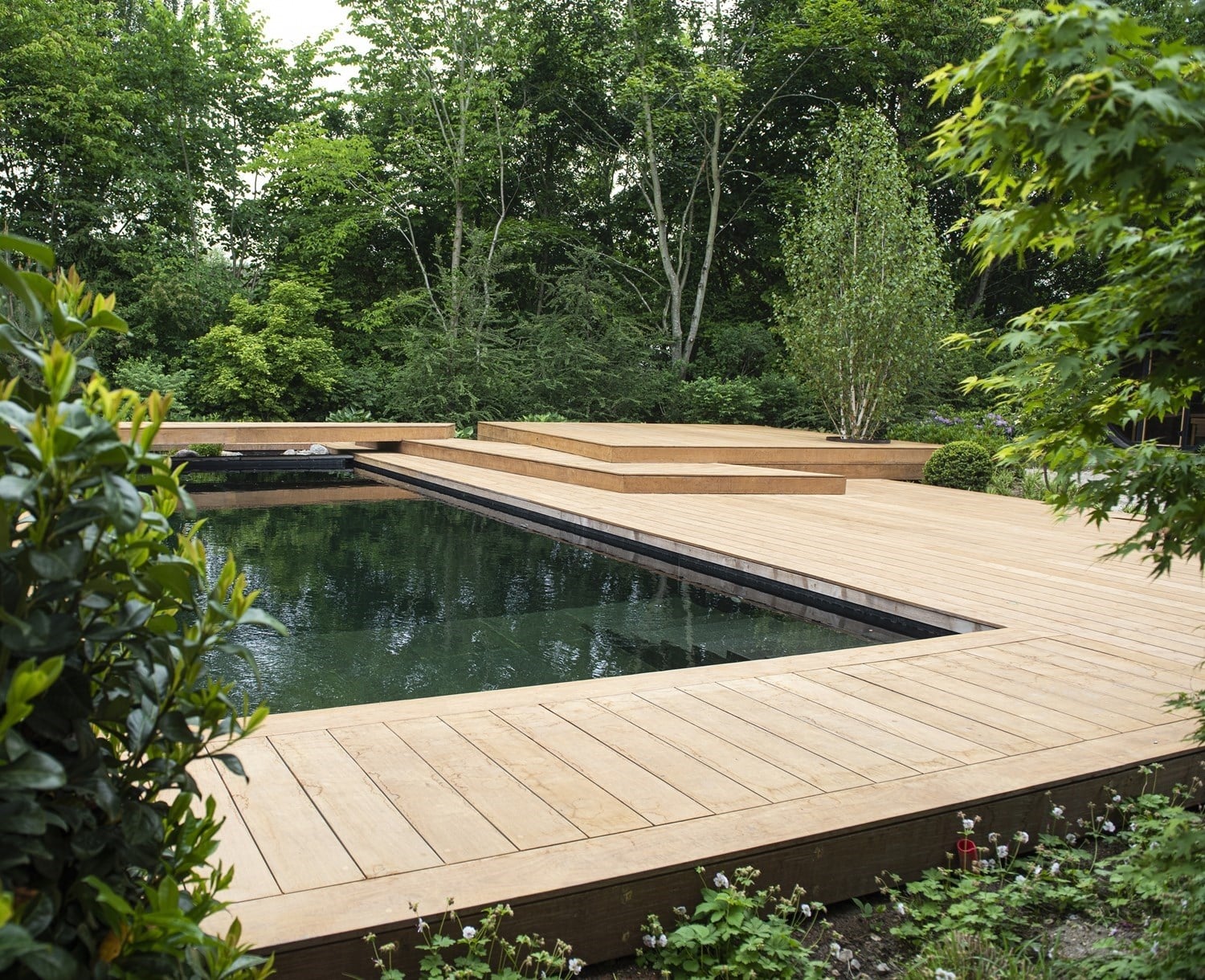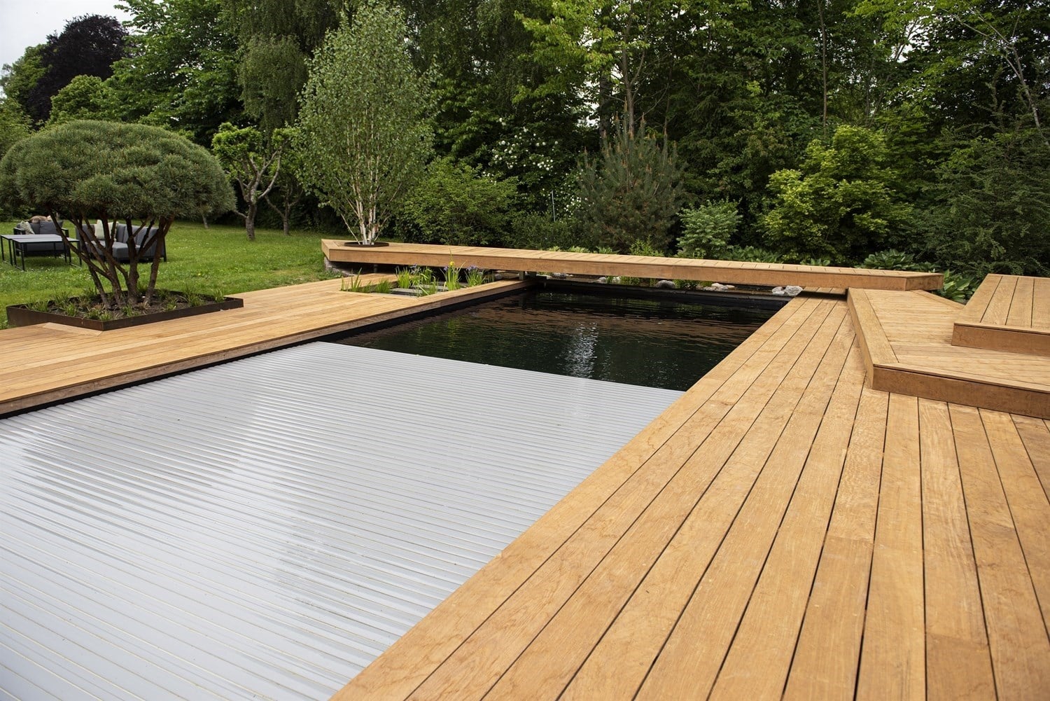 Naturpoolen måler 4×10 meter – 2 meter dyb – lavt vands zone på 120 cm, med en granittrappe til land.