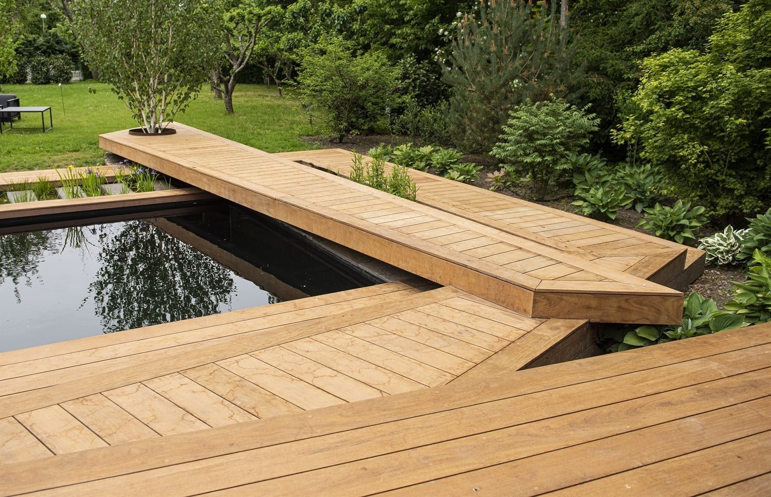 Den svævende udspringsbro er hele 7 meter lang og konstrueret af smedefirmaet Dennis Martlev, Martlev.dk som stålkummer og kanterne også er.