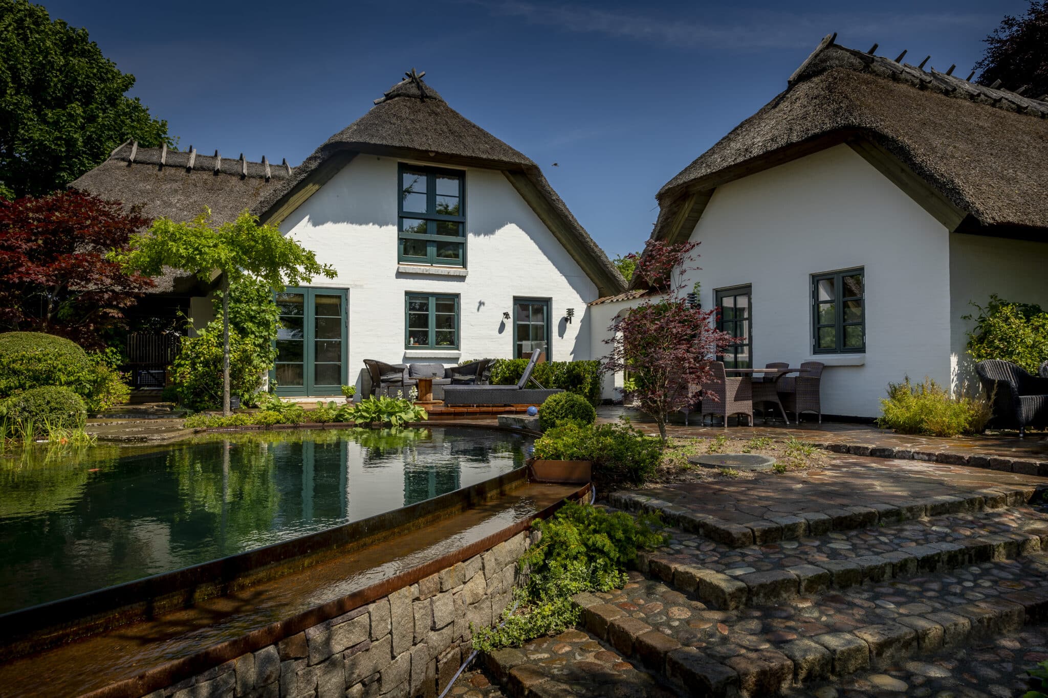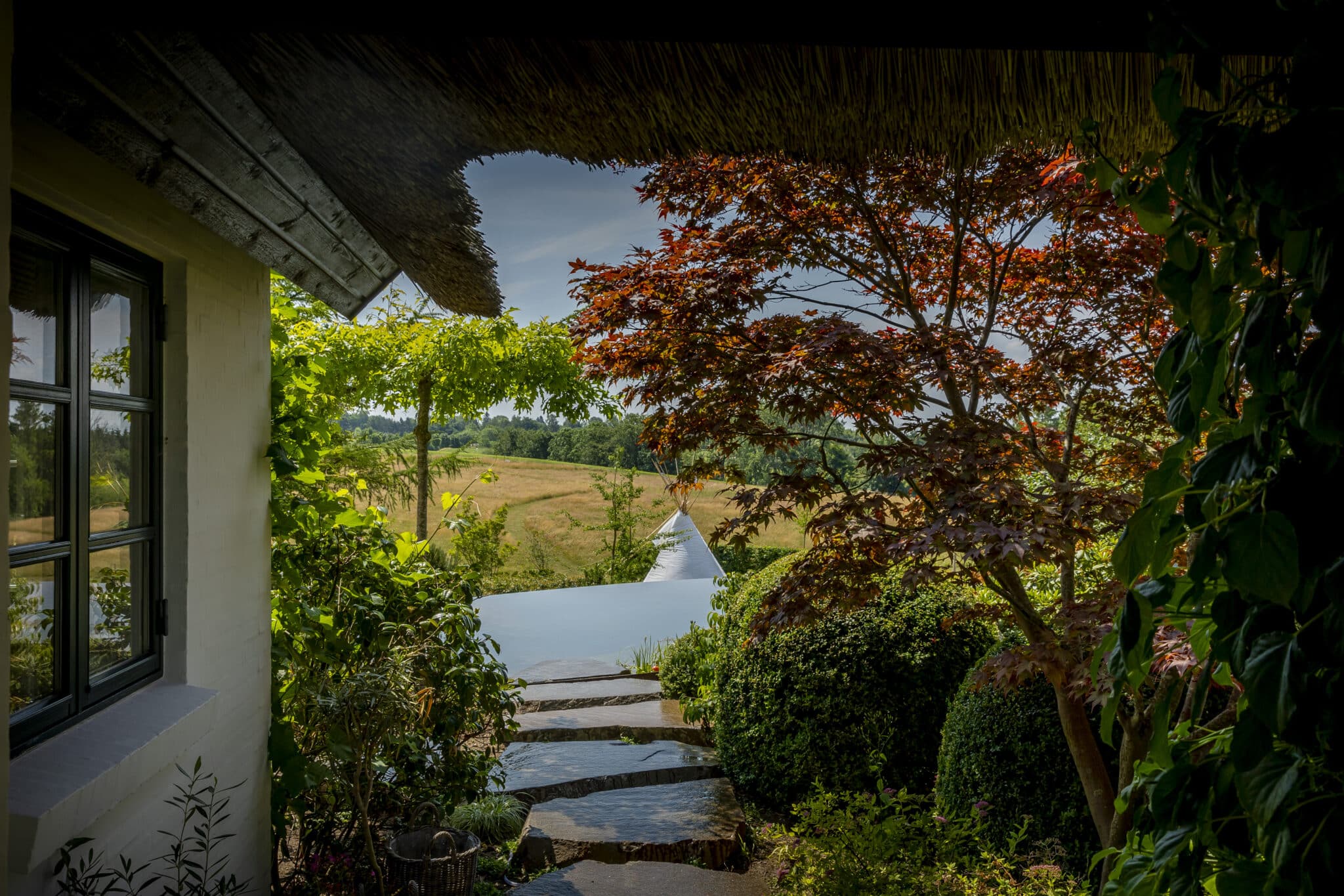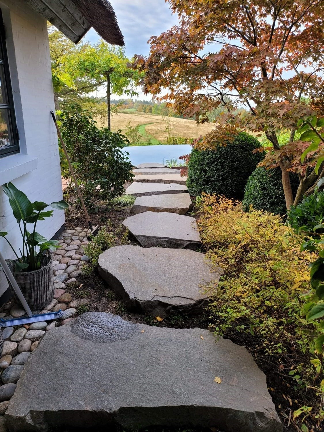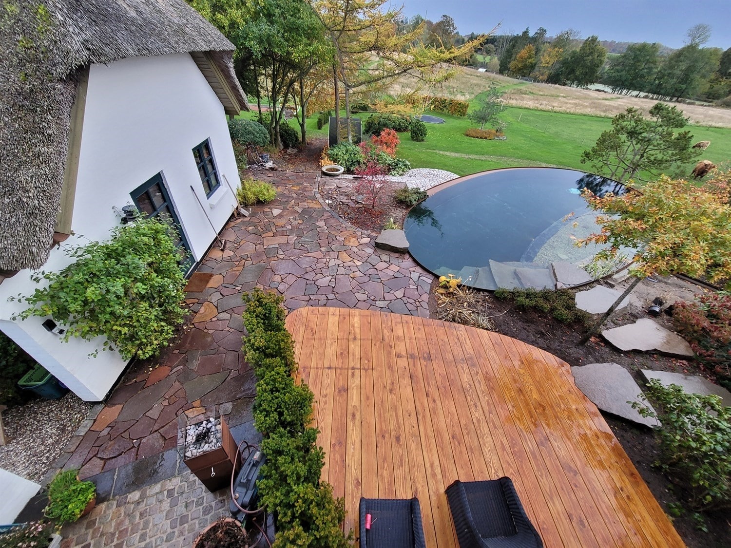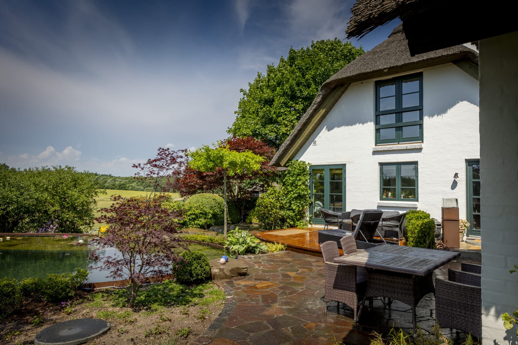 Terrasse på land i porfyr brudfliser, træterrasse i douglas plank