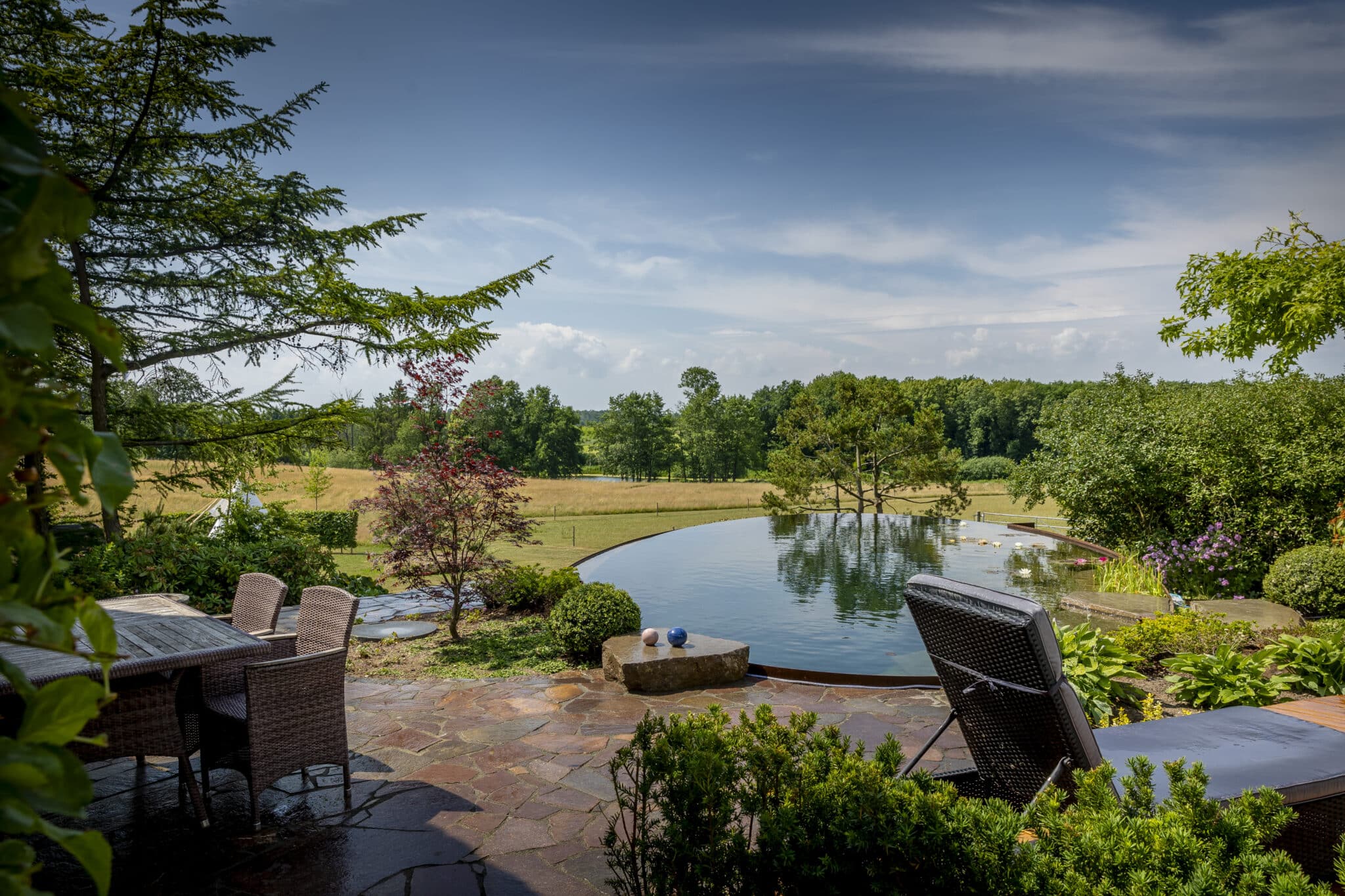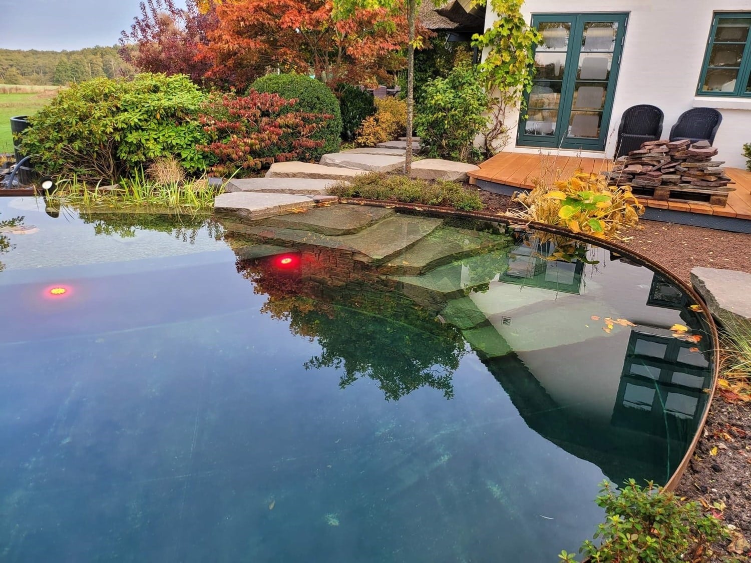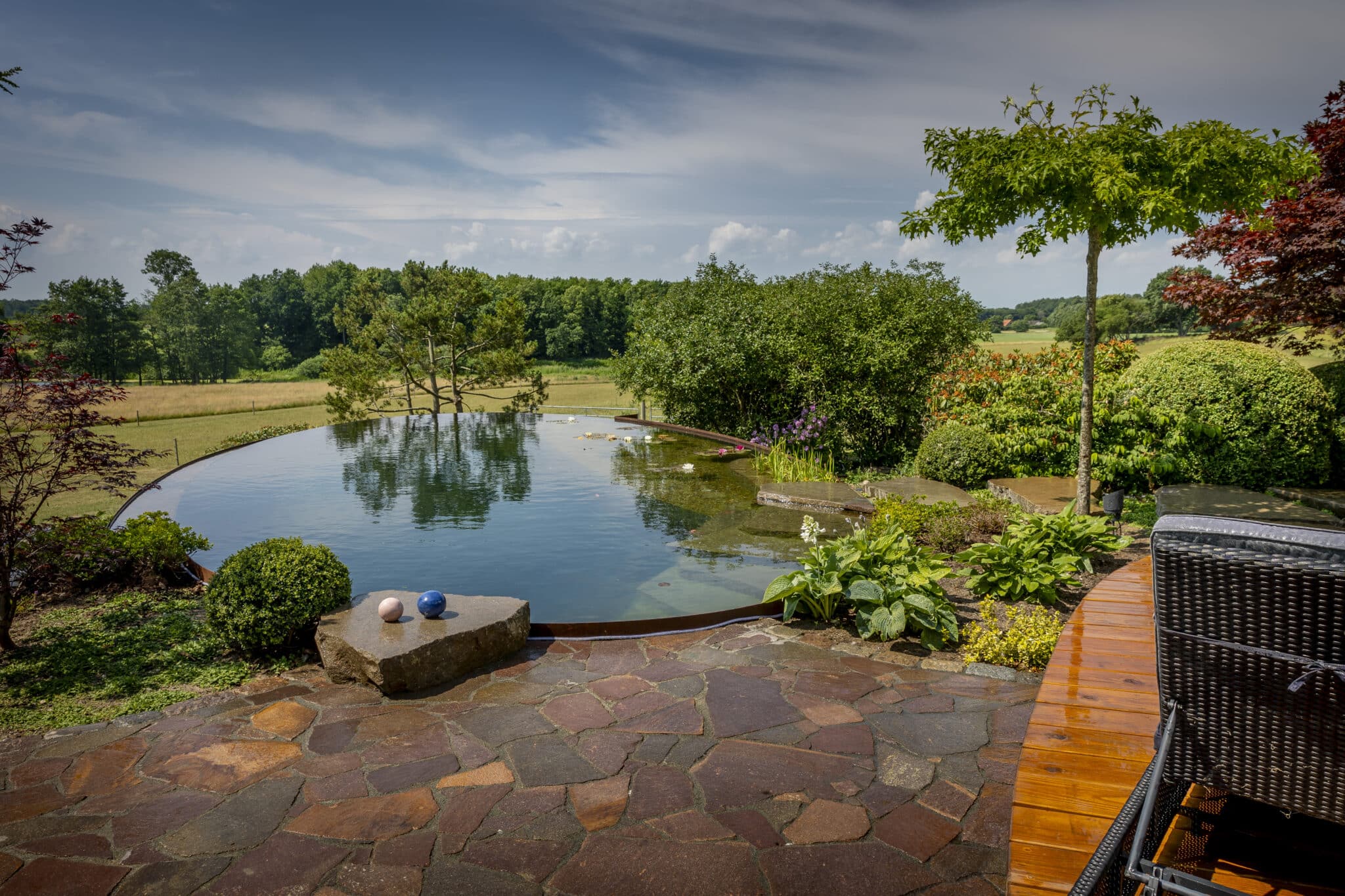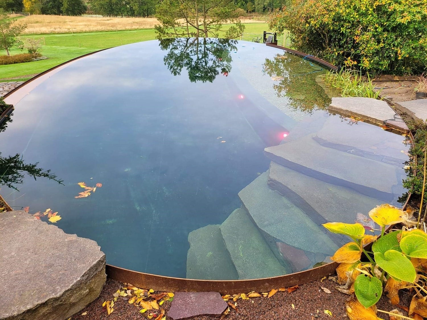 ​Elipseformet naturpool 11×6 meter – med indbygget biologisk vandrensning tilplantet med nøkkeroser​