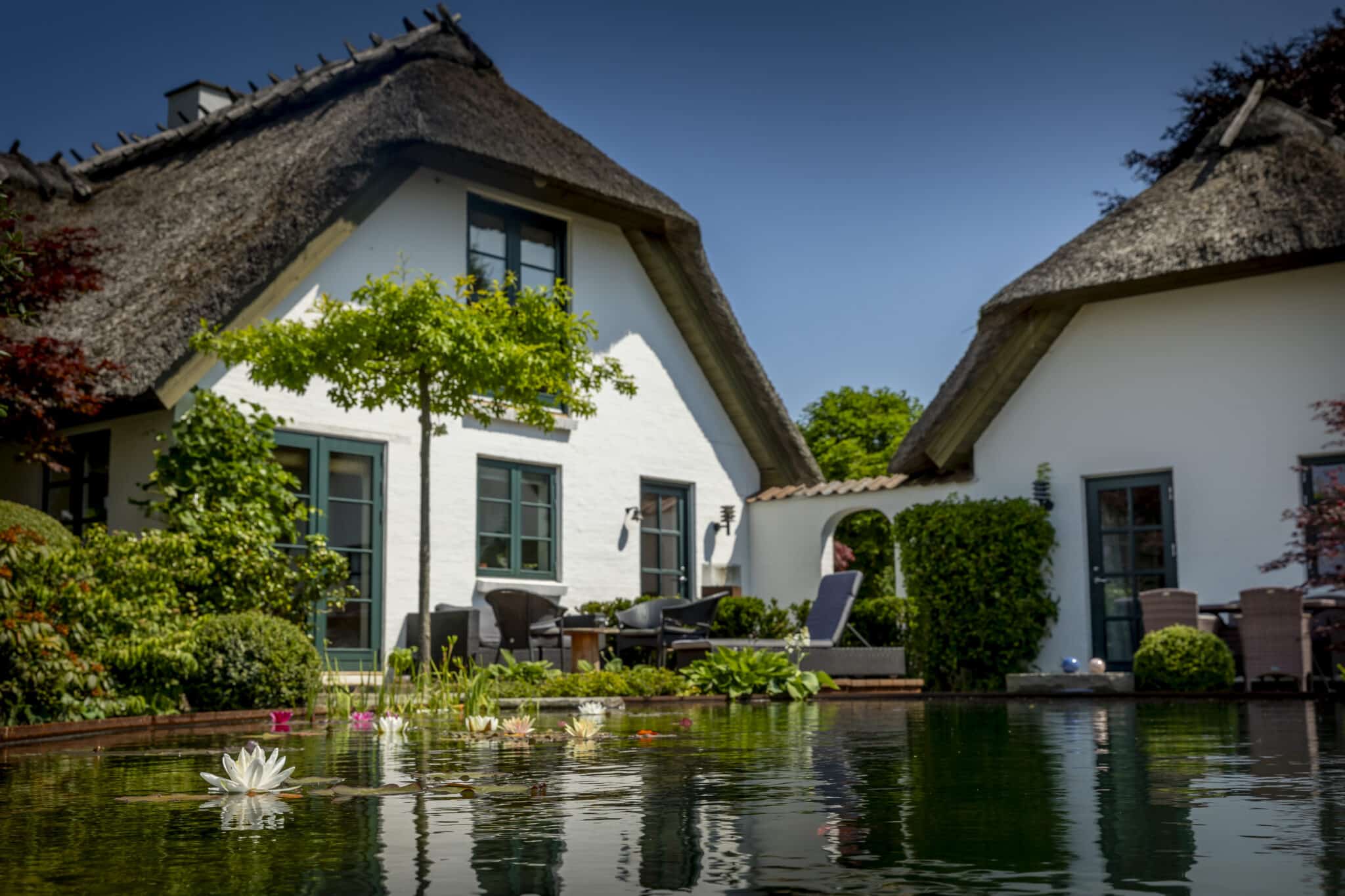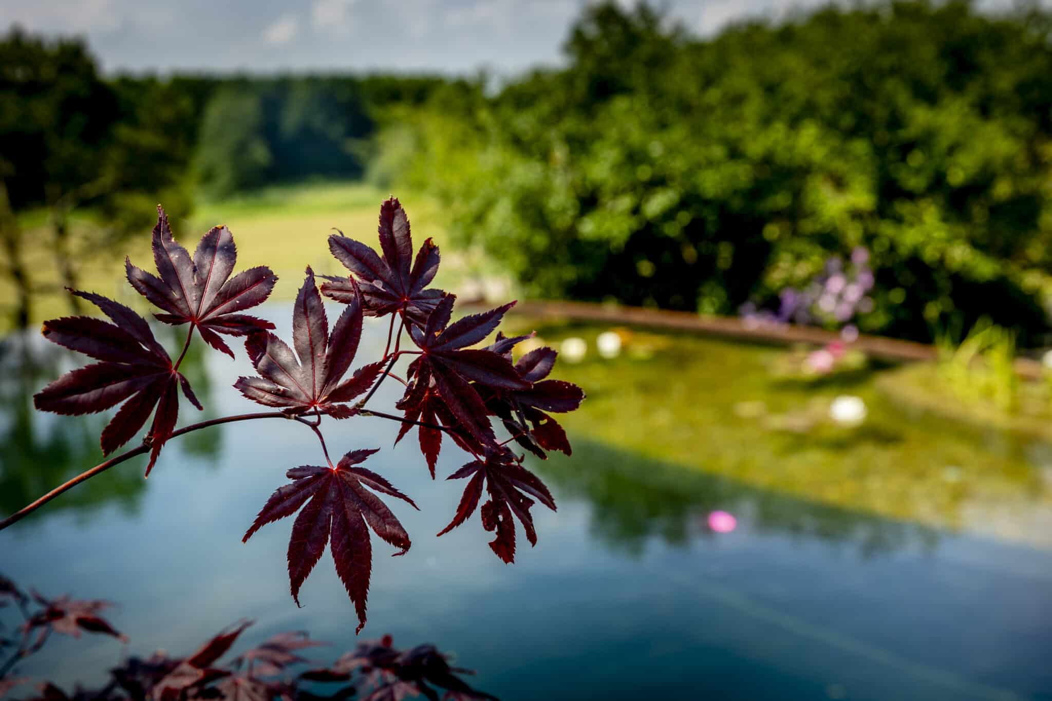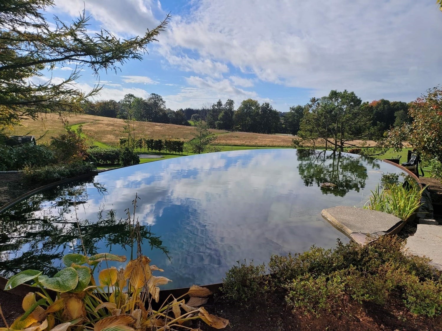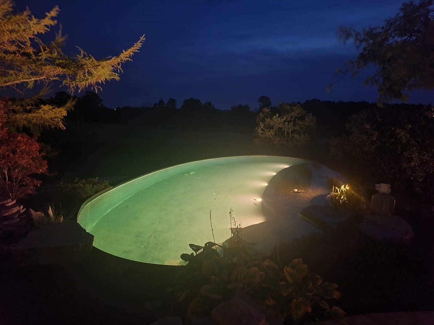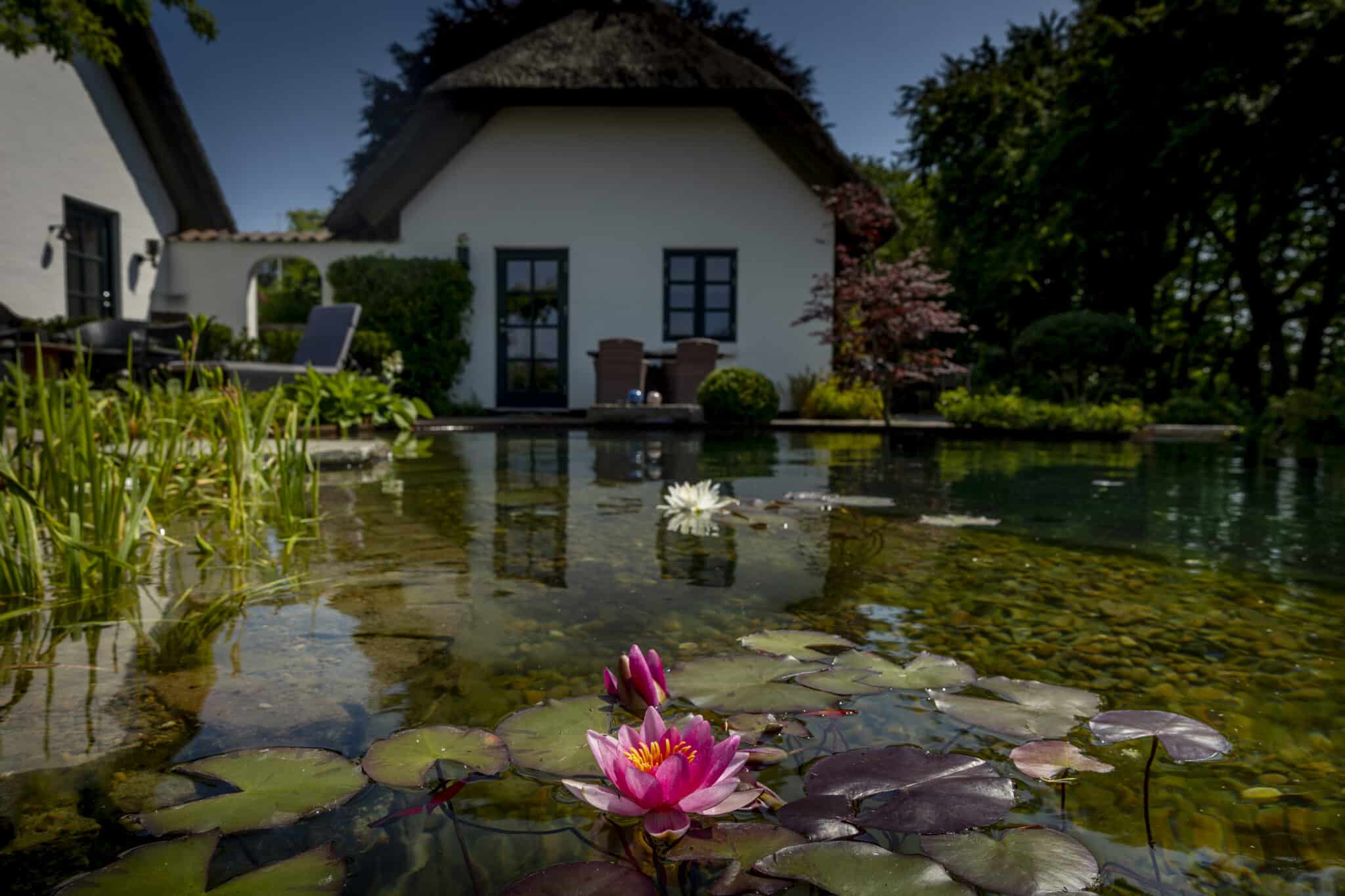 ​Elipseformet naturpool 11×6 meter – med indbygget biologisk vandrensning tilplantet med nøkkeroser​