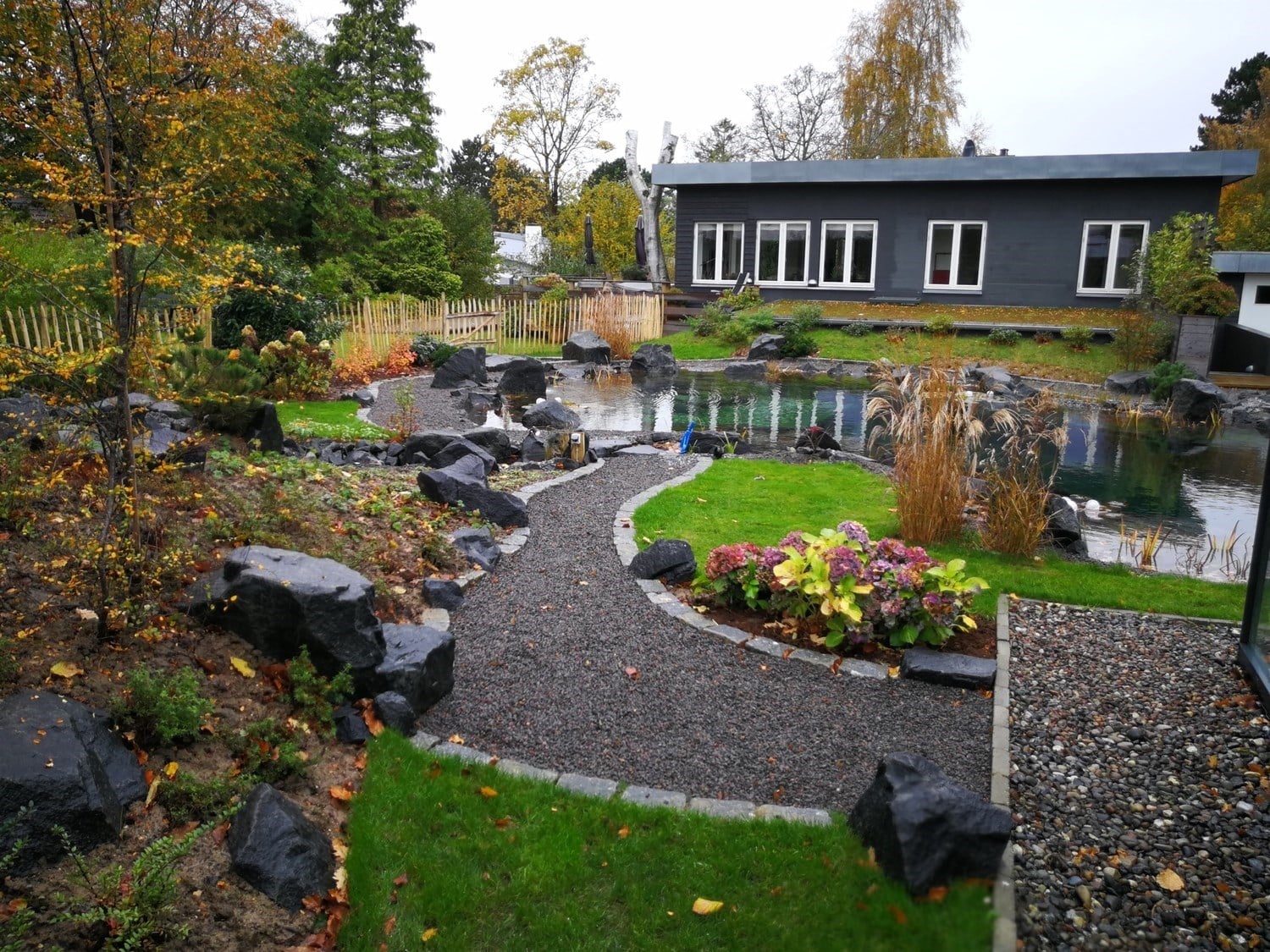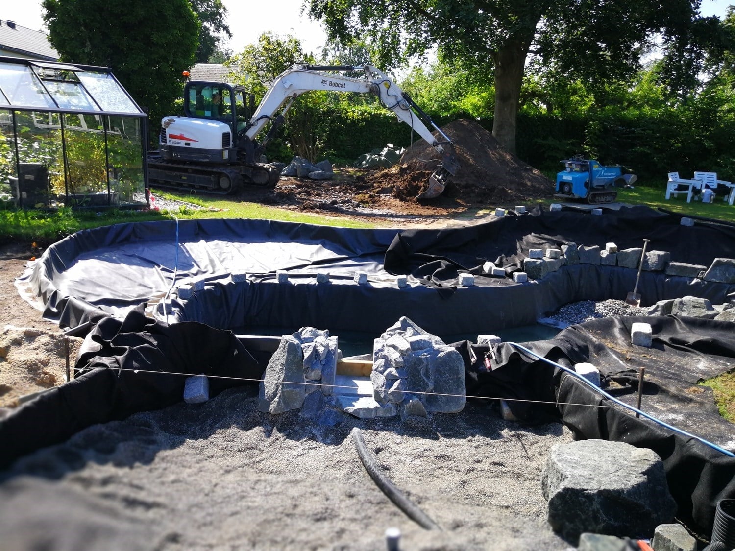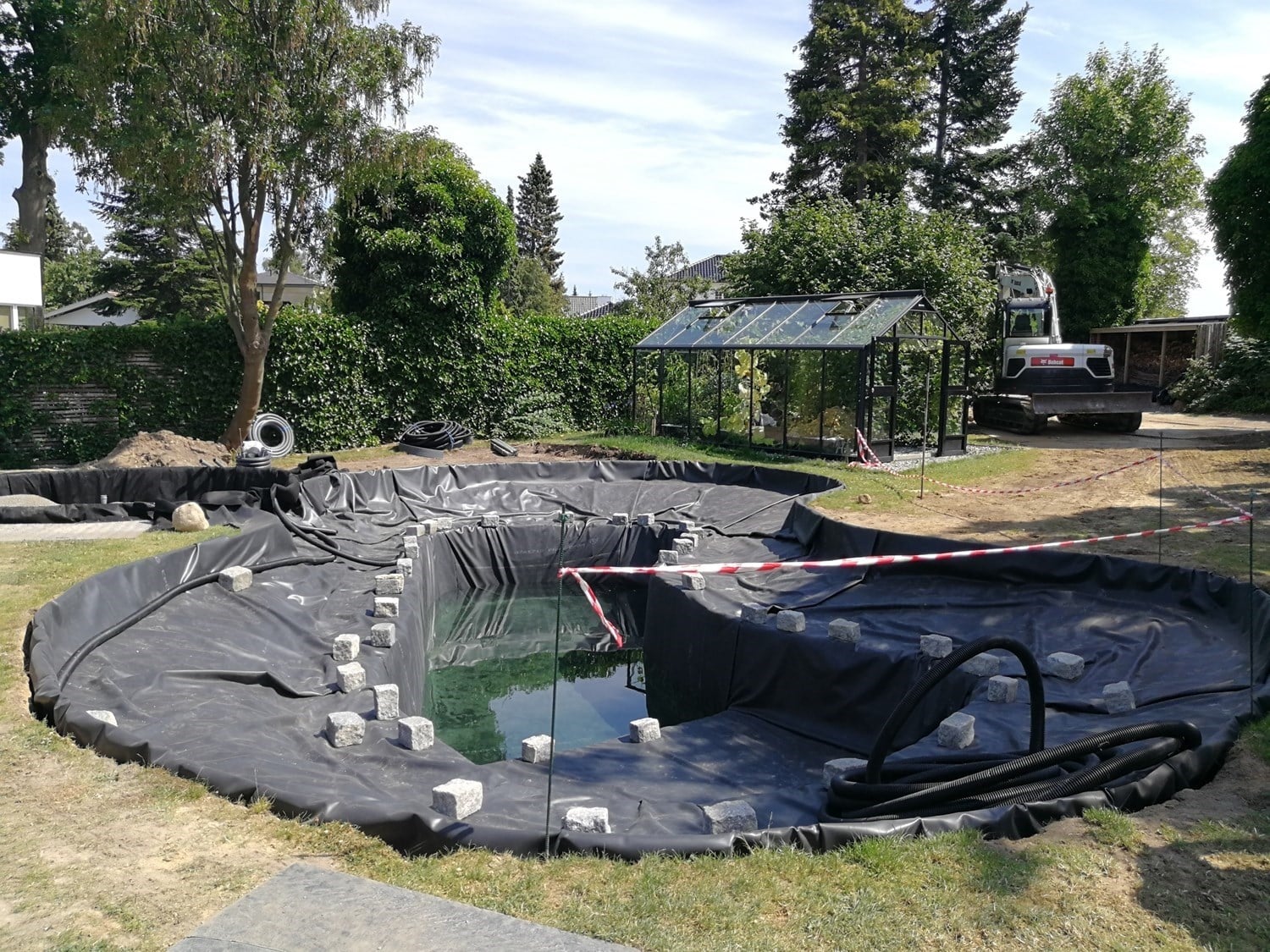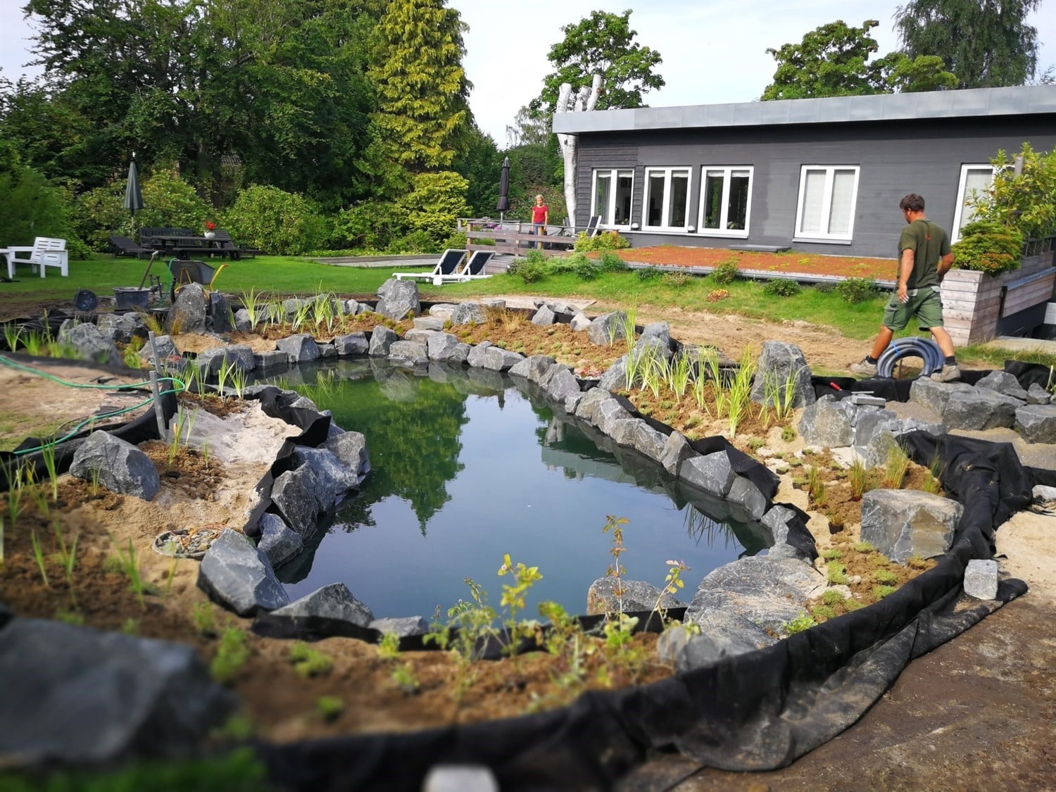 - Skimmersø areal ca. 15-20 m2 der indbygges bredzoner til vandplanter i skimmersøen 5 cm’s vanddybde i kanten og lavtvandsområde ca. 30 cm dybt foran skimmerfunktion