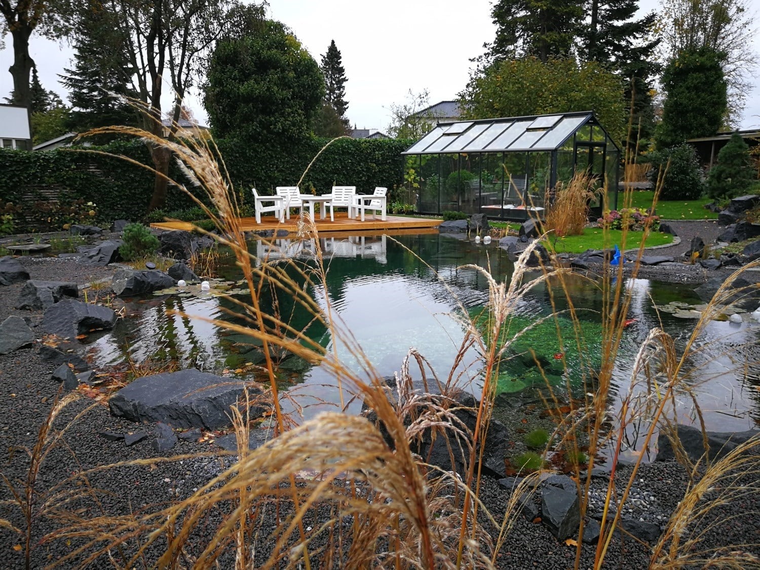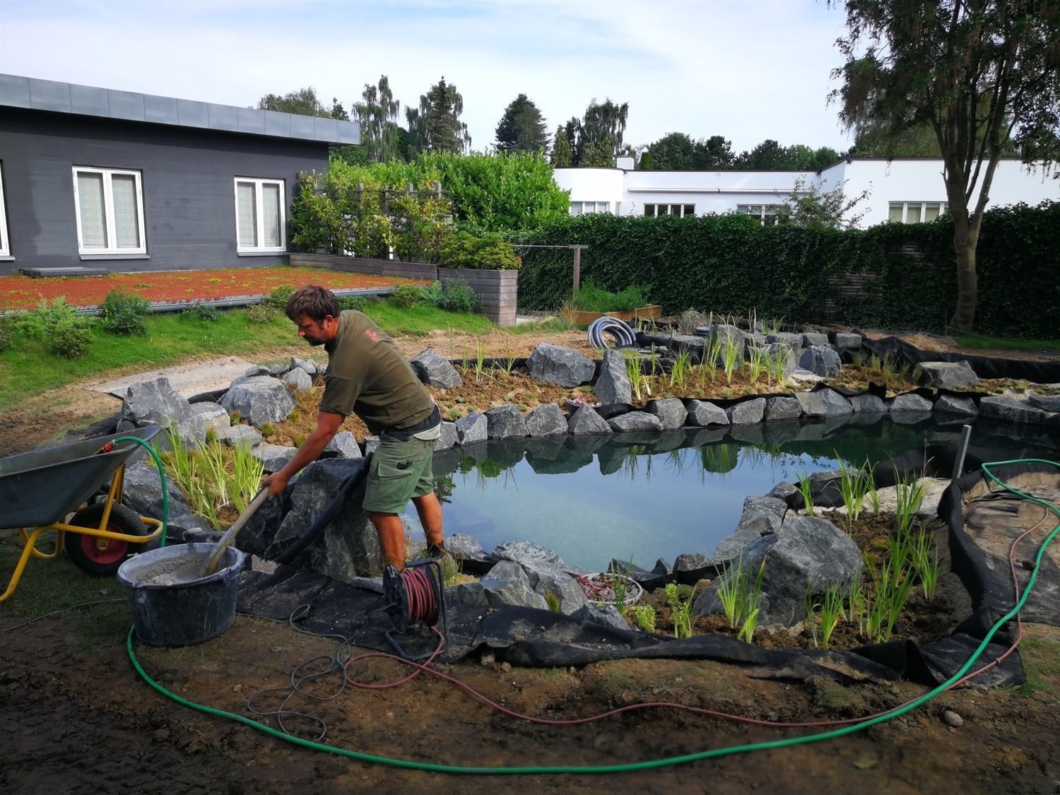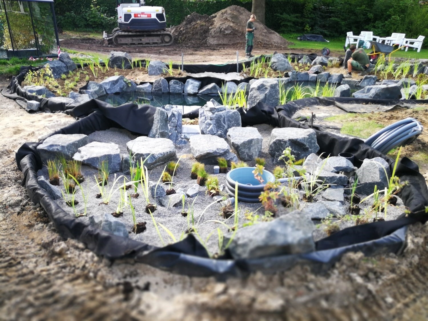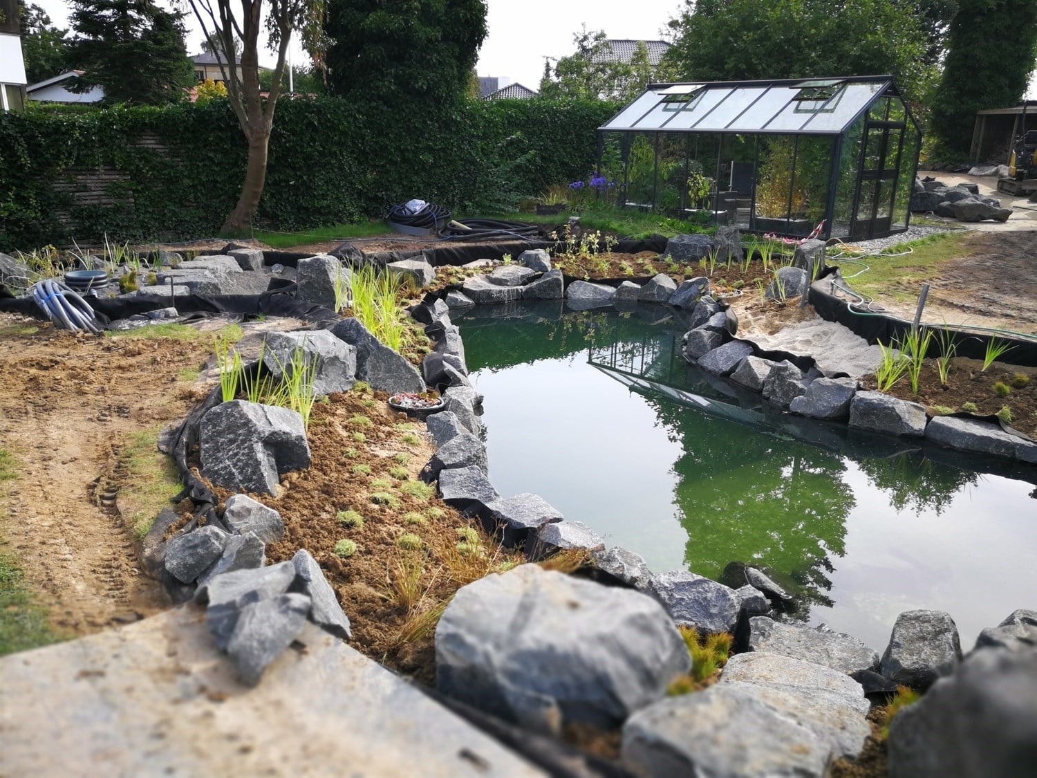 - Skimmersø areal ca. 15-20 m2 der indbygges bredzoner til vandplanter i skimmersøen 5 cm’s vanddybde i kanten og lavtvandsområde ca. 30 cm dybt foran skimmerfunktion
