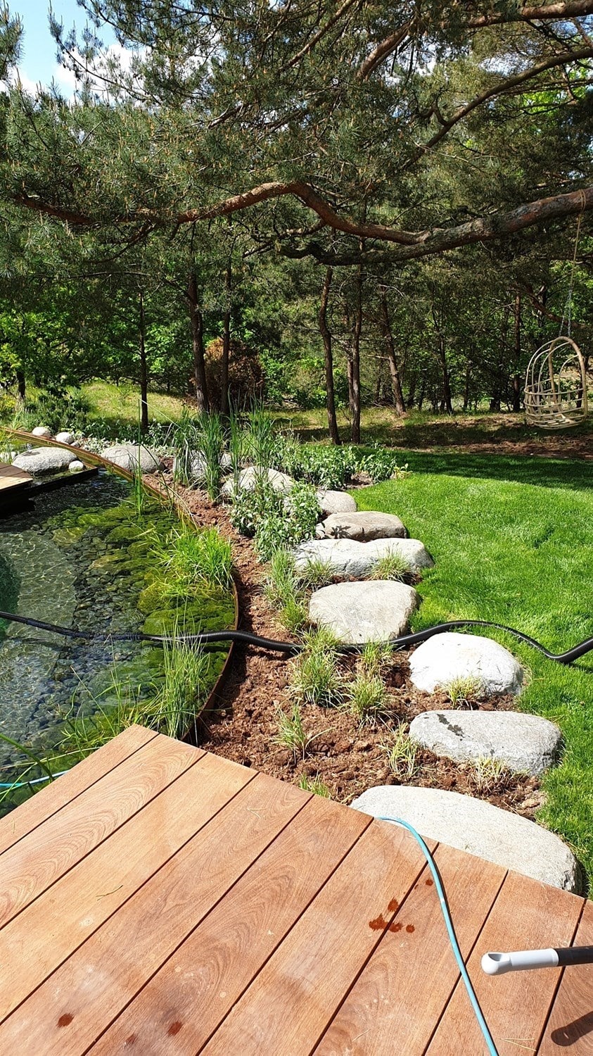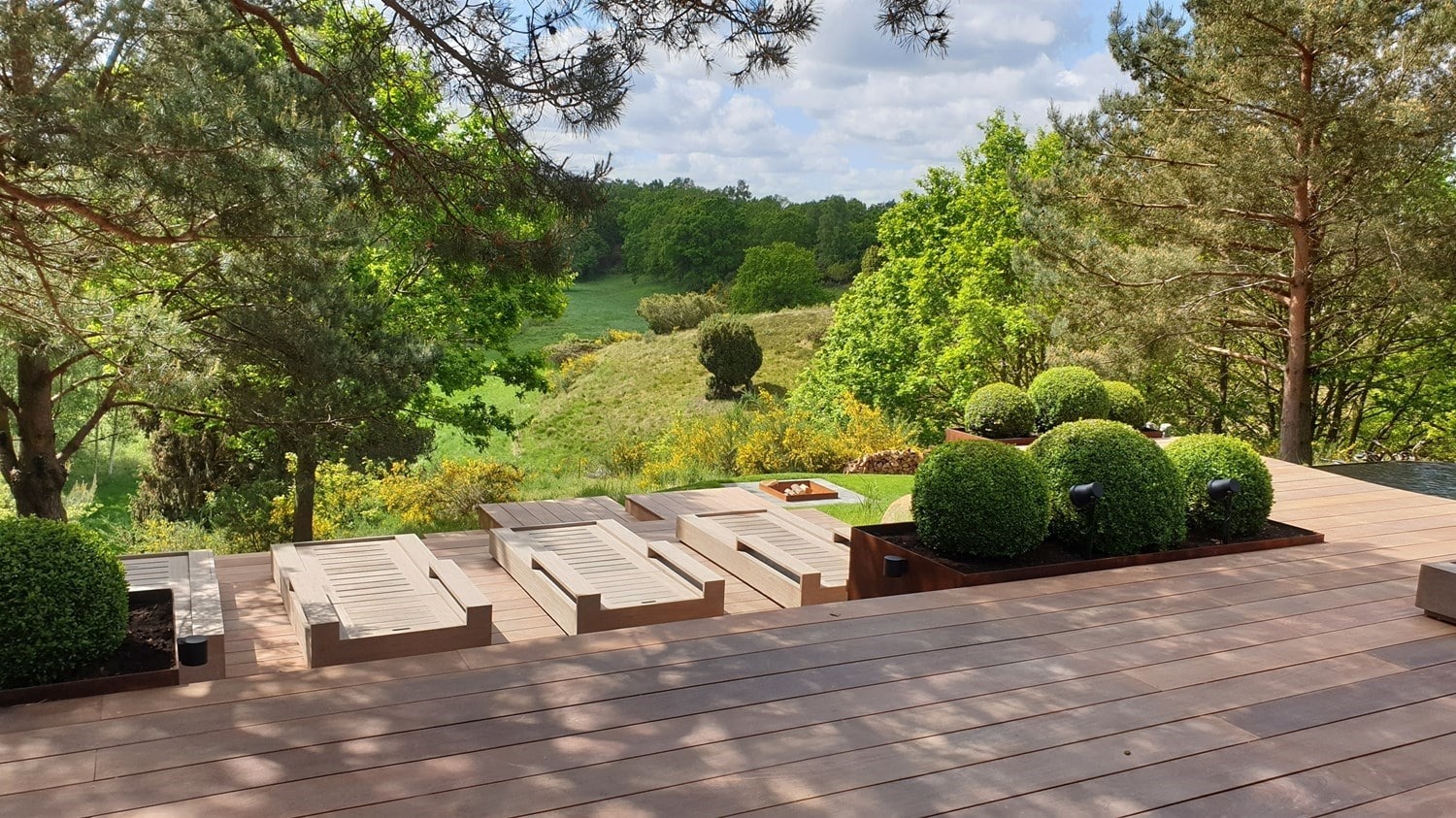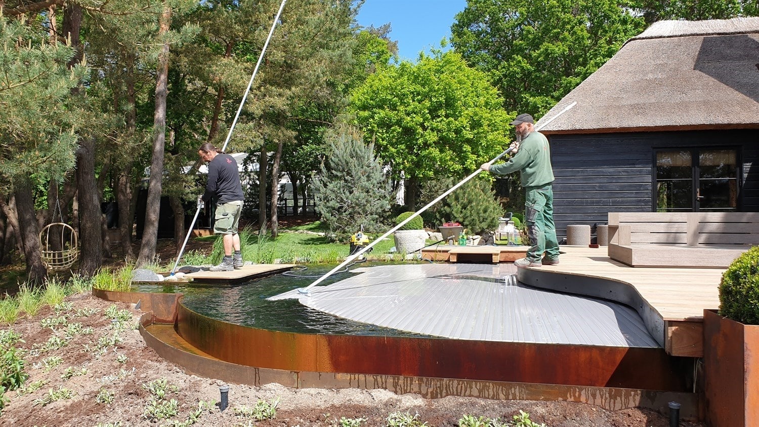 Søen er opvarmet med en luft til vand varmeveksler til 25 grader i sommerperioden og er derfor også monteret med et sikkerheds- varme Cover fra T&A. Coveret skjules på fornem vis., når det er rullet sammen under den store buede træterrasse.