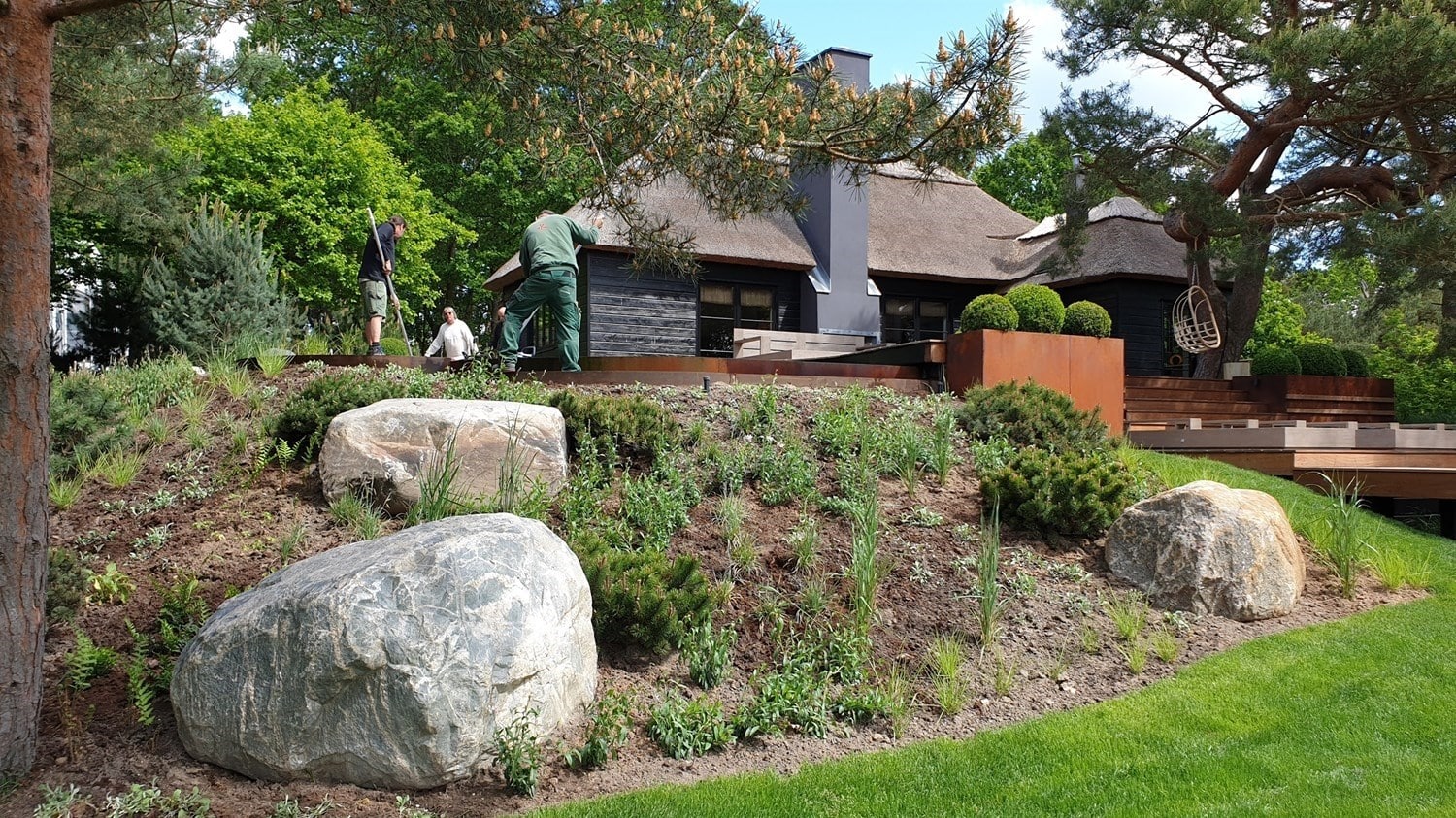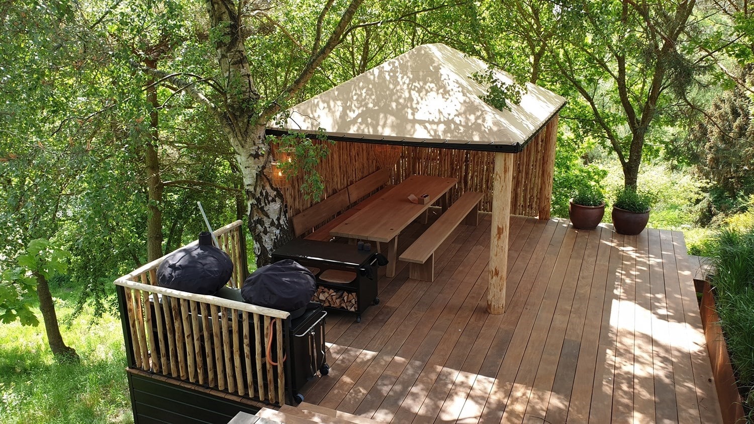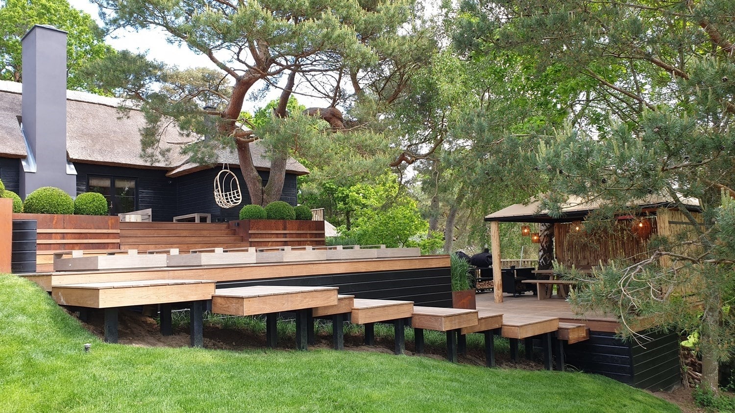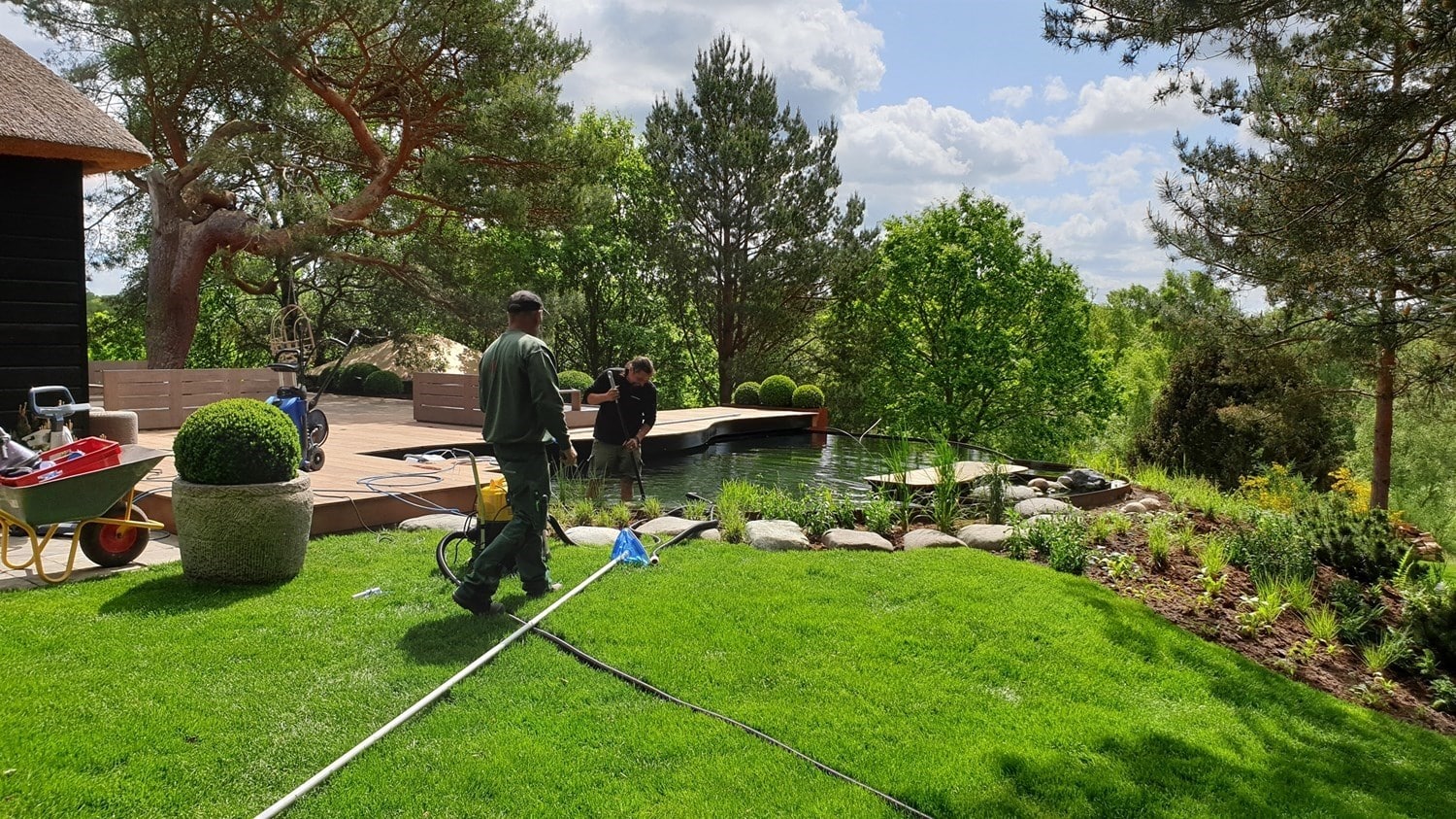 Søen er opvarmet med en luft til vand varmeveksler til 25 grader i sommerperioden og er derfor også monteret med et sikkerheds- varme Cover fra T&A. Coveret skjules på fornem vis., når det er rullet sammen under den store buede træterrasse.