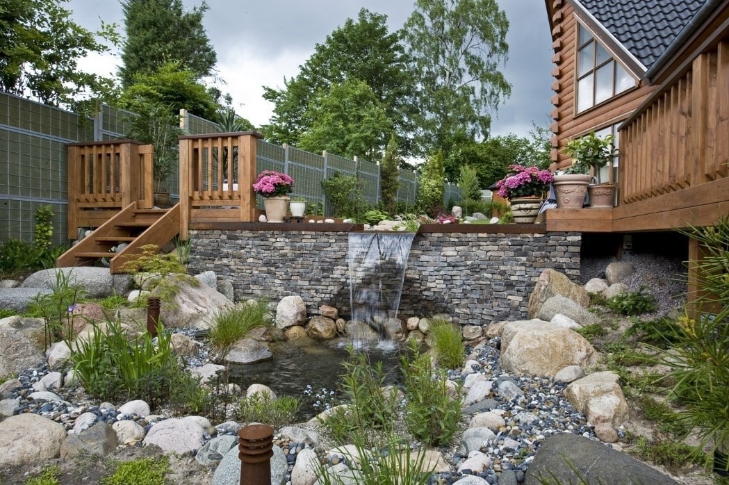 Havens niveauer er udnyttet til at skabe et slyngende vandløb, der kan skimtes i baggrunden langs græsset. Vandet risler til svømmesøen, hvor der bades, og løber derfra udover et gardin fald til skimmer søen, beliggende i havens nedre niveau. Svømmesøen er fuldstøbt og udvendigt beklædt med skal mursten. . Vandgardin faldet er udført i stål. Stålet sørger for et kontrastfyldt, solidt og rustikt look til huset og havens øvrige materialevalg. Svømmesøen er fuldstøbt, udvendig på muren mod skimmer søen er der beklædt med specielle skal mursten.